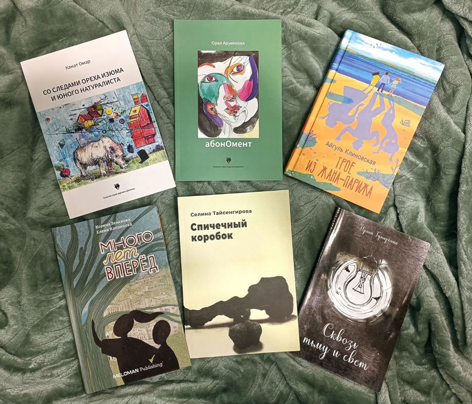 🚩 На фото мои приобретения: четыре сборника стихов (Канат Омар, Орал Арукенова, Селина Тайсенгирова, Ирина Гумыркина) и две книги прозы (Ксения Земскова, Елена Клепикова, Айгуль Клиновская). Еще есть книга Омара Нурхайдарова «Нежить Пржевальского», но мне ее подарили, так что на фото ее нет.